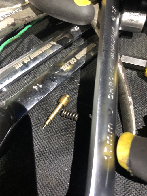 あれ? なんか足元に落ちてた。 エアスクリュー調整ドライバー、人生で何度出番があることだろう。 仮締めして忘れたぽい。 戻し量は1 ,3/4 +-1/4てことで とりあえず1回転半で。 あと半回転戻しまでで調整する。 フラッシングオイル排出。メタル汚れあり。 #ZZR600 pic.twitter.com/qYu4BKKatO